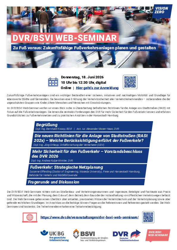 Die kostenfreien DVR/BSVI-Web-Seminare vermitteln innerhalb von etwa zwei Stunden einen Überblick über aktuelles, praxisnahes Wissen der Verkehrstechnik und der Verkehrsplanung sowie über die rechtlichen Grundlagen, und geben Anregungen für weiterführende Quellen. Die Beispiele aus der Praxis illustrieren konkrete Good-Practice-Umsetzungen zu einem jeweiligen Thema. Im Anschluss an die Beträge können Fragen an die ausgewählten Referentinnen und Referenten gestellt werden.